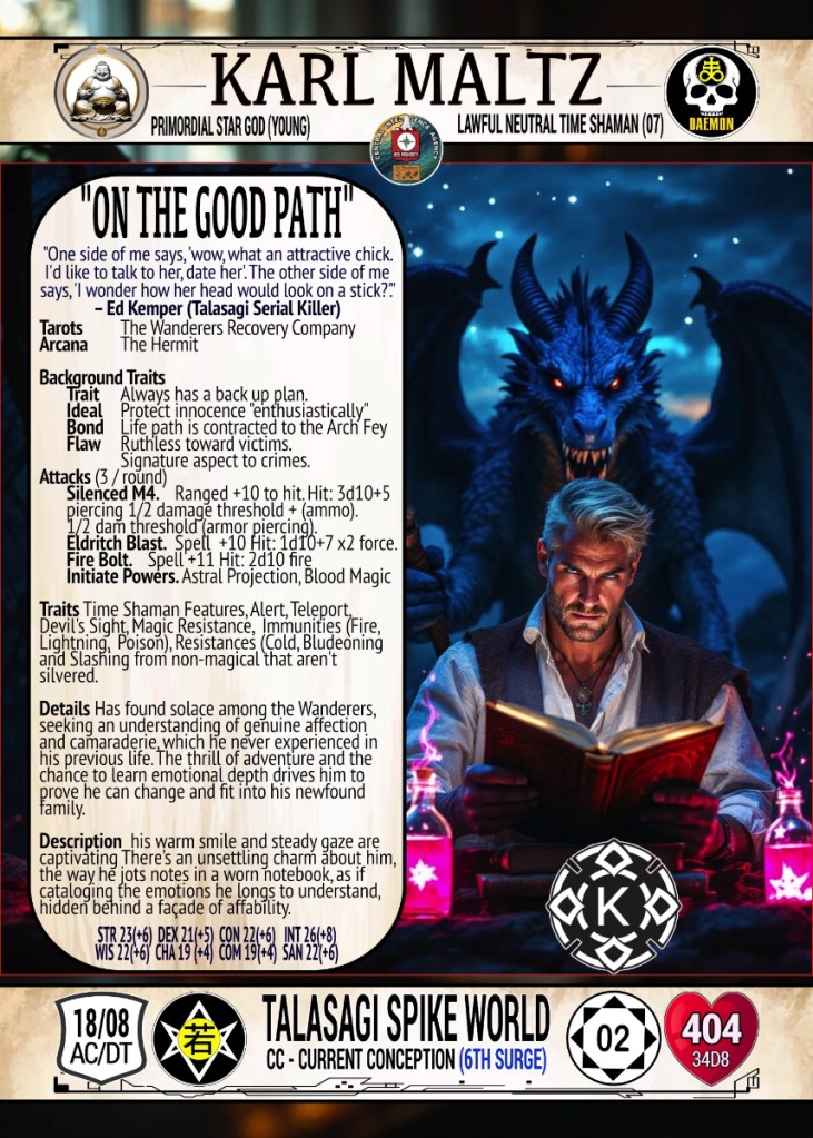 In draconic form, he’s cobalt-scaled and lightning-winged, a predator of skies. In human form, he’s striking: notebook in hand, smile disarming, his presence comforting and terrifying.